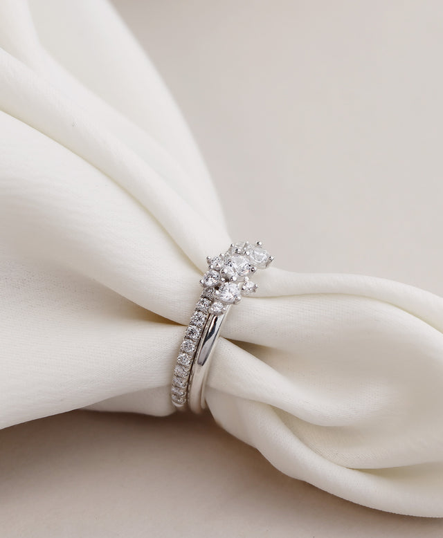 Celine diamond ring is just as beautiful worn alone as it is with another ring. Choose an alliance ring that has a band of diamonds like the Elise Alliance Ring . You can also wear Celine ring with a plain silver ring .