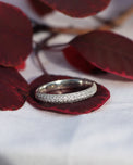 Alliansring med flera små diamanter tätt infattade i flera rader. Ringen har mjuka bekväma former med rundad ovansida.
