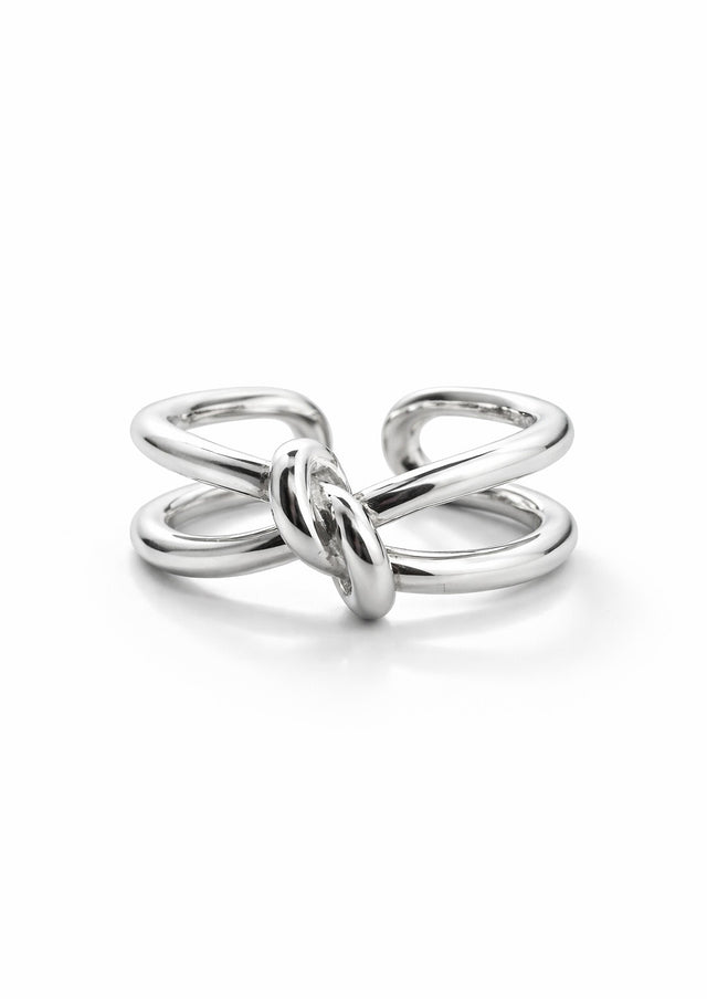 Zeitloses Cuff-Armband mit doppelten Armreifen, die sich in einem klaren, eleganten Knoten vereinen.